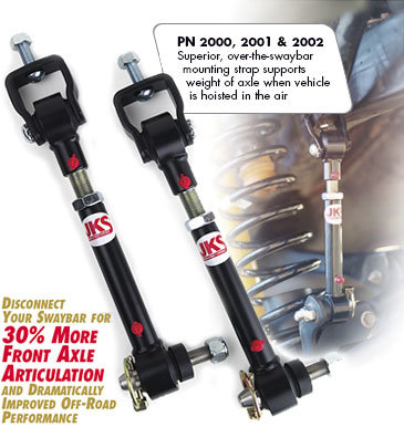 The unique design of JKS Quicker Disconnects enables the user to quickly and easily fine tune the length to compensate for vehicle changes, such as: spring settling or sagging, minor lift changes, heavy accessories, vehicle trim or rake adjustments, and other factors that affect ride height. For use with OE Sway Bar Only.